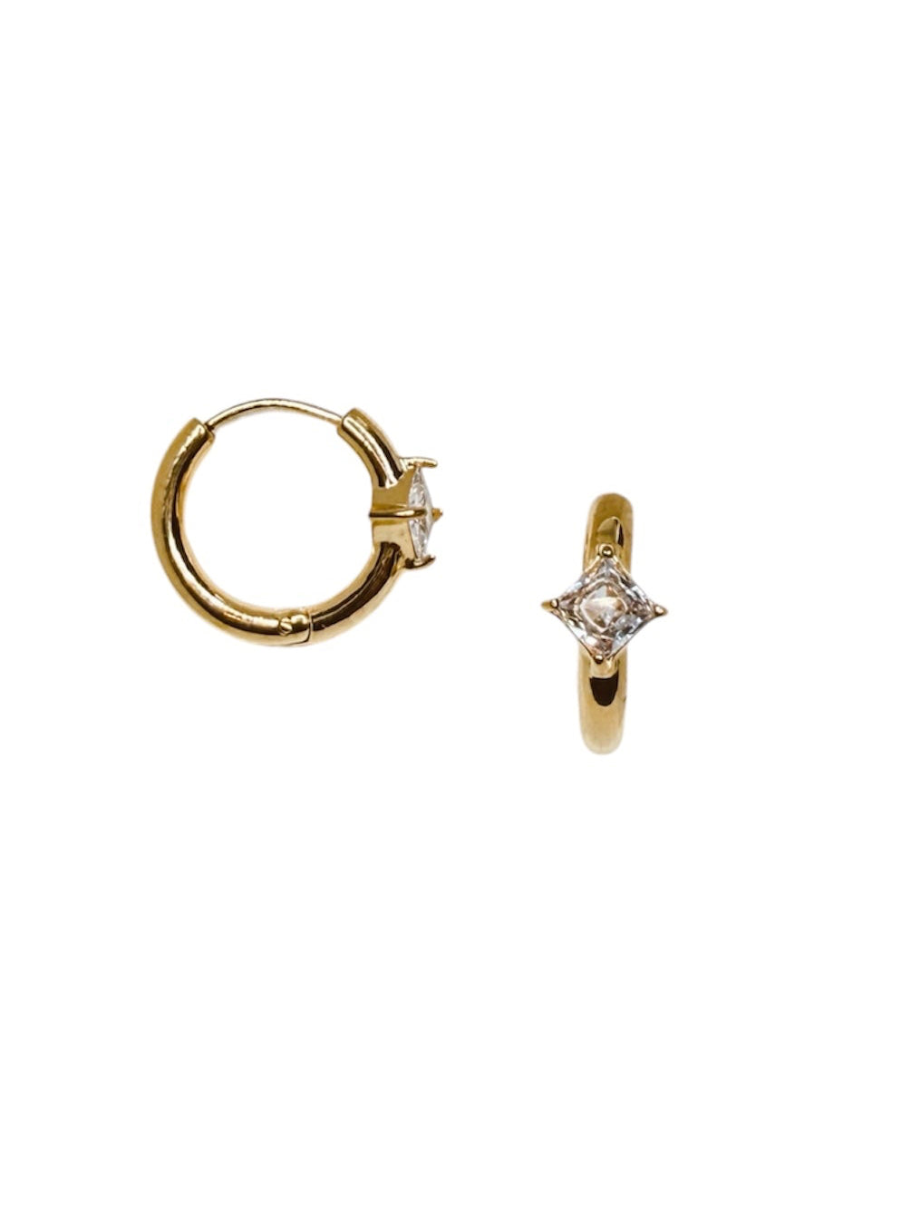 Our Princess Huggies Feature a sleek huggie silhouette with a radiant princess-cut stones. These earrings hug your ears perfectly—catching the light (and compliments) from every angle.